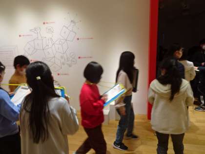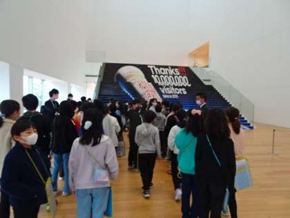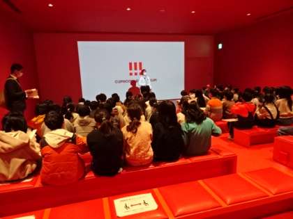 最初の見学場所は、「カップヌードルミュージアム」です。インスタントラーメンを発明した創業者の業績を映像で見た後は、グループごとにクイズを解きながら見学をしています。