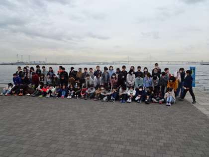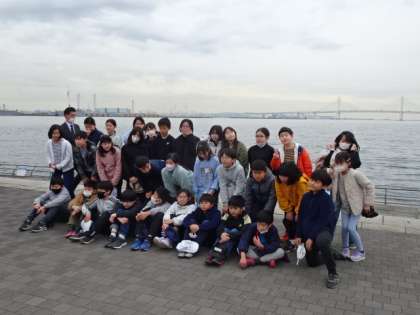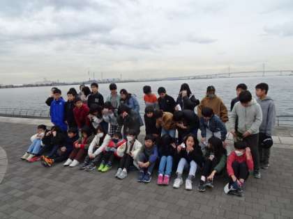 お弁当を食べ終わったて学級、学年の集合写真を撮りました。曇っていて分かりにくいですが、「横浜ベイブリッジ」をバックに記念写真を撮っています。