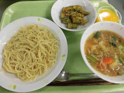 みなさんの大好きなラーメンです。麺類の提供は、給食ではとても難しく、お店やお家でたべるような、麺がおいしい状態での提供ができないことが残念です。でも、その中でも少しでもおいしく食べられようにと調理員さんたちは工夫を凝らしています。