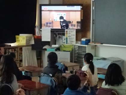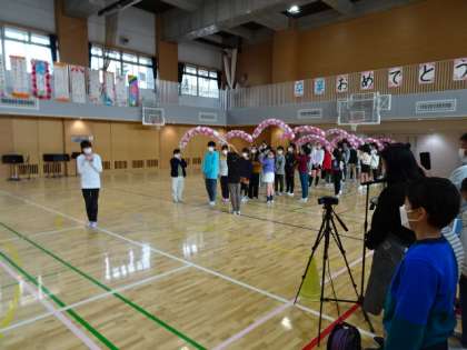 6年生を送る会を行いました。今年度も体育館にいる6年生の前で1年生から5年生までが順番に来て出し物を行う形で行いました。自分の学年以外は、教室でテレビ中継を見ました。6年生の体育館への入場の様子です。代表委員が一人一人の名前と得意なことなどの紹介をしてくれています。