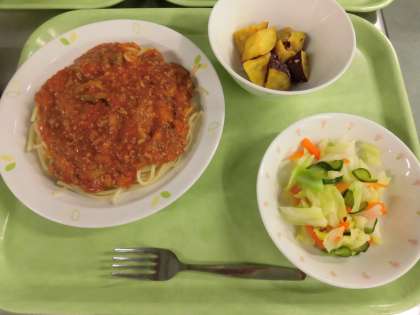 ミートスパゲッティ 牛乳 野菜の甘酢かけ シナモンポテト