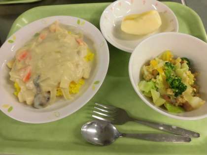 こめ(秋田) とりにく(岩手) ベーコン(ぶたにく 埼玉) いか(青森) ほたて(北海道) 調理用牛乳(生乳 東京) たまご(青森) たまねぎ(北海道) にんじん(千葉) きゃべつ(愛知) ブロッコリー(香川) 黄ピーマン(パプリカ 茨城) グリーンピース(北海道) マッシュルーム(千葉 茨城) りんご(青森)
