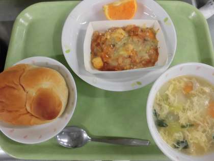 パインパン 牛乳 豆腐のグラタン たまごと白菜のスープ くだもの