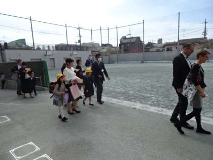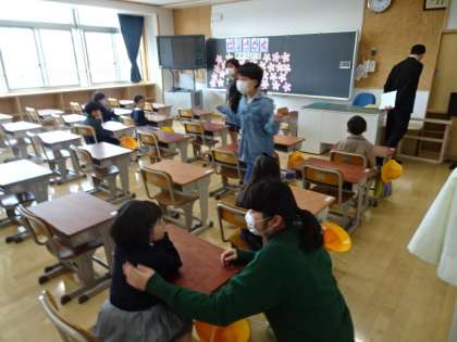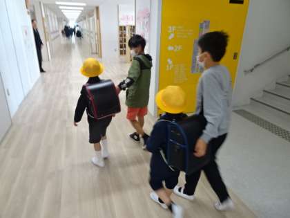 始業式を終えて子どもたちが下校した後、新1年生が学校にやってきました。黄色い帽子をかぶって元気に登校してきました。クラス名簿を6年生からもらい受付をした後は、保護者の方と別れて6年生に教室まで案内してもらいました。お家の人と別れて不安そんな子もいますが、しっかりといすに座って入学式が始まるのを待っています。