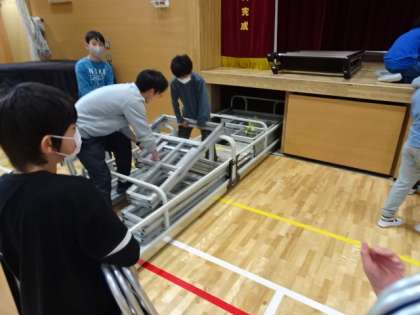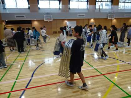 最後に集合写真を撮った6年生が体育館に残って、入学式で使ったいすなどの片づけをしてくれています。みんなで協力して手際よく片付けをしてくれました。