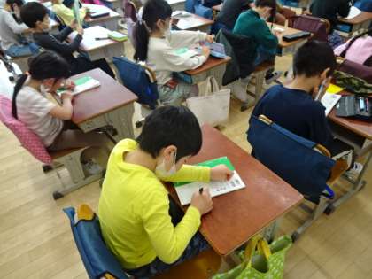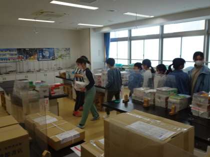 理科室にある新しい教科書を協力して教室に運びました。教室では、先生からもらった教科書に名前を書いています。学年が上がるほどたくさん名前を書かないといけませんが、一冊一冊丁寧に名前を書いています。これからどんなことを学習するか楽しみですね。