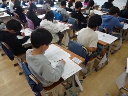 4年生から6年生が、世田谷区の習熟度確認調査を行いました。昨年度の国語、算数、社会、理科の問題に挑戦です。初めての4年生も真剣に取り組んでいました。