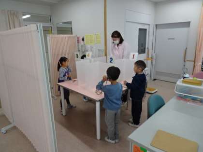 1年生が聴力検査を受けました。井原先生の説明をしっかりと聞いて検査に臨んでいました。音を出さないように静かに待つこともできてとても立派です。