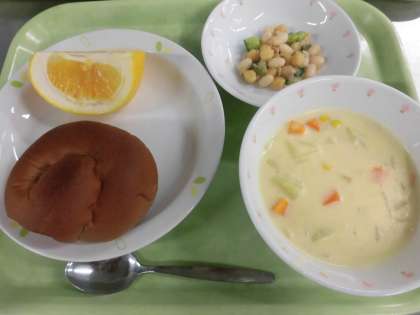ココアパン 牛乳 チキンクリームスープ ビーンズサラダ くだもの
