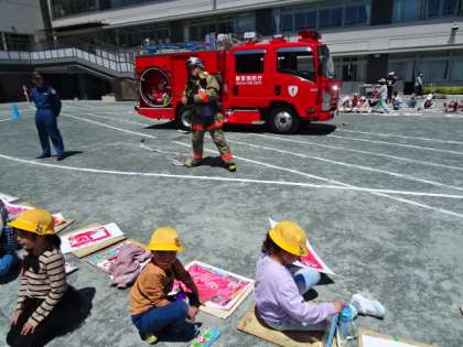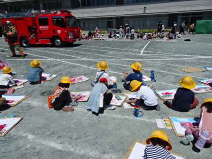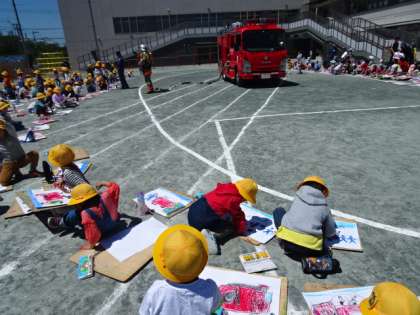良い天気の中、消防車が学校にやってきました。1年生は初めての「消防車写生会」です。本物の消防車を見て喜んでいる子がたくさんいました。しっかりと見ながら絵を描いていました。
