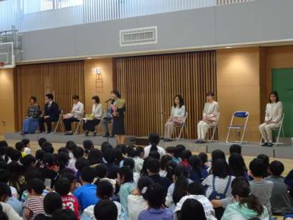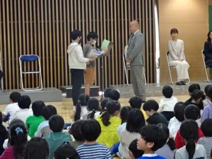 3月で本校を去られた教職員のみなさんをお招きして離任式を体育館で行いました。2年生から6年生が一堂に会しての体育館での離任式。9名の方が来校してくださいました。代表の言葉、花束の贈呈のあと、離任された先生からお言葉をいただきました。たった1か月しかたっていませんが子どもたちの成長の様子を褒めていただきました。最後にはみんなで感謝の気持ちを込めて、校歌を歌いました。心を一つにしたよい離任式になりました。