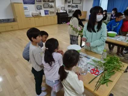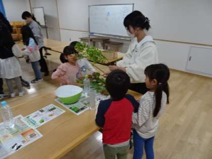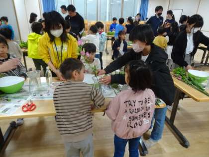 5月の「花を生ける日」の活動がありました。今回からは1年生も参加しています。6年生に教えてもらいながら、協力してお水を過敏に入れて、茎を切ったりしながら生けています。話をよく聞いて頑張っています。