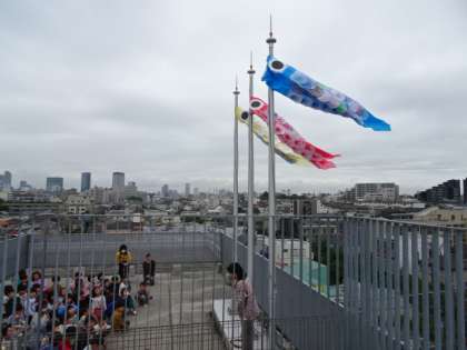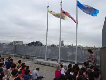 1年生がみんなで作った大きなこいのぼりを屋上のポールにあげました。風に吹かれてこいのぼりが泳ぎだすと大きな歓声が聞こえました。下校の時に、こいのぼりに気が付いた高学年の子どもたちも「こいのぼりだ」と喜んでいました。