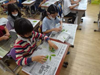 3年生が、給食にでるグリーンピースのさやむきをしました。栄養士の方から、色々な豆を消化してもらってから、みんなでさやから豆を取り出しました。固いものもあり苦労している子もいましたが、すぐに慣れて、全校分のグリーンピースを取り出しました。初めてやった子も多く、楽しく活動していました、取り出したグリーンピースは給食室に渡して調理してもらいました。