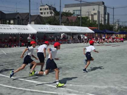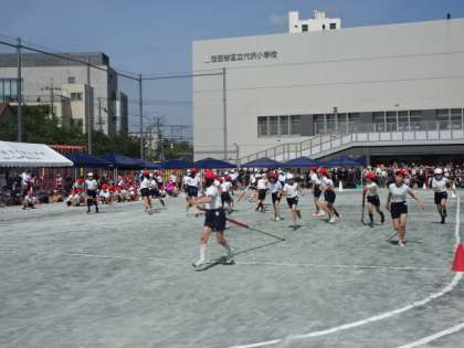 5年生の団体競技「5G(ファイブジー)★ 棒っと生きてんじゃねーよ!」です。長い棒と短い棒、どちらをねらうか、チームで作戦を立てて協力して棒を運びました。