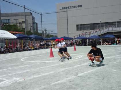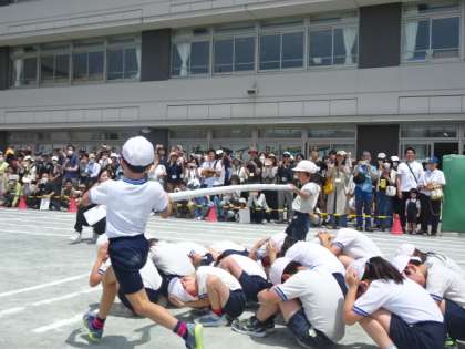 3年生の団体競技「3 SUN タイフーン」です。一つの棒を協力して持って走りました。コーンをうまく回るのに工夫が必要です。棒を飛び越える、戻ってくる棒をしゃがんで通すのはみんなの協力が必要です。最後に全員で丸くなって座るのも上手にできました。