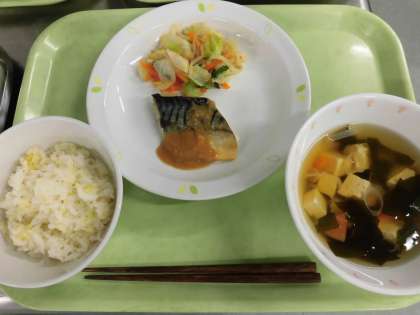 今日の魚は、さばです。大きくなると体長は50cm位にまで成長します。さばには、血液をサラサラにする働きのある油が含まれています。さばの写真を配膳室の前に掲示しています。どんな魚なのか見てください。