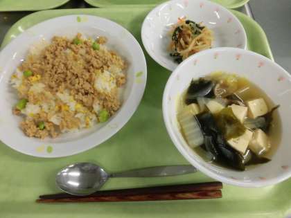 “そぼろ”というのは、どのようなものか分かりますか?そぼろは、肉や魚、溶き卵をゆでたり炒めたりして、汁気がなくなるまで細かくぽろぽろにほぐしたものです。給食では、今日のそぼろ丼の他にも、そぼろ煮、そぼろあん などが登場します。献立にそぼろという名前を見つけたら、どんな料理だったか思い出してくださいね。