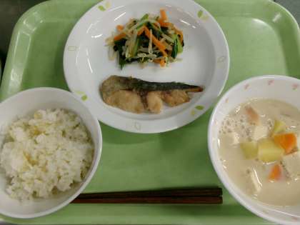 麦ごはん 牛乳 魚の梅肉焼き 野菜のあえ物 白いみそ汁