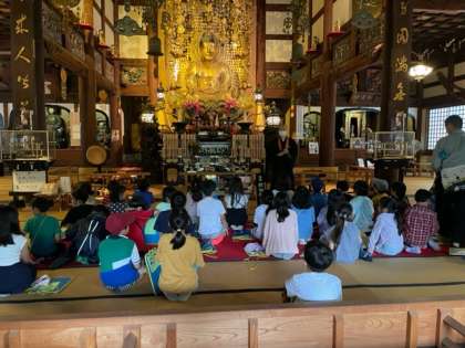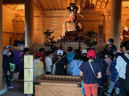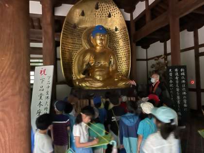 世田谷通り、環八を通って、最後の見学地、九品仏浄真寺に到着。クラスごとに説明を聞きながら見学しています。