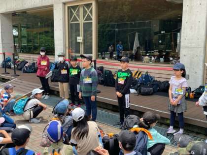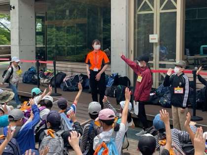 フジヤマビレジに到着。開室式をしています。ビレジの方にあいさつをして生活がはじまります。1日、協力して過ごしましょう。