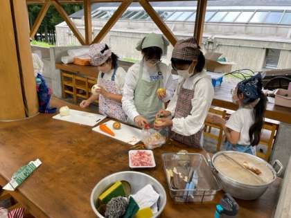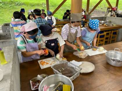 包丁やピューラーを使って食材を切っています。かまども順調に火がついてきました。