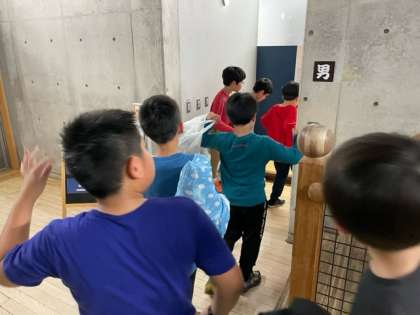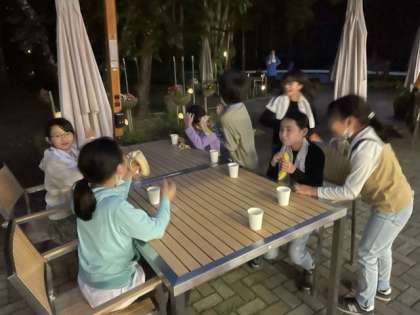 キャンプファイヤーの後、バナナとリンゴジュースを飲んで入浴です。温泉でさっぱりしましょう。