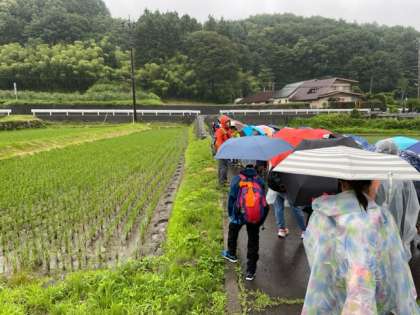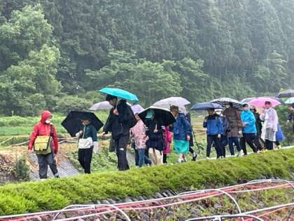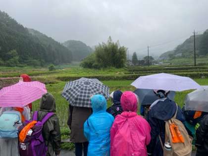 雨の中の村巡り。ガイドさんの説明を聞きながら続けています。