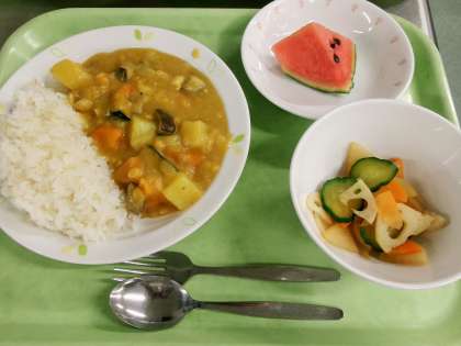 今日は、夏野菜が入ったカレーです。カレーに入っているどの野菜が夏に旬を迎える野菜なのか考えながら食べてみましょう。くだものの 小玉スイカも、旬のくだものです。食べ物から夏を感じてほしいと思っています。