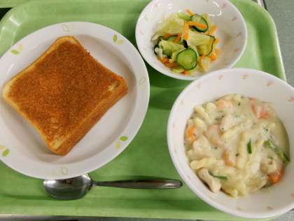 きなこは、何から作られているか、知っていますか。きなこは、大豆を炒ったものを粉末に加工したものです。今日は、国産の小麦粉で作った食パンに、きなこと砂糖、バターを練り合わせたものをぬってオーブンで焼きました。給食室の中は、きなこの香ばしい香りが漂っています。香り、味を確かめながらいただきましょう。