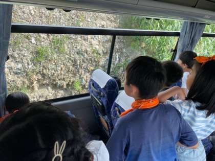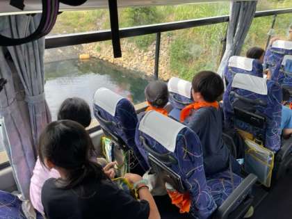 バスに乗って、粗大ゴミ、不燃ゴミの中間処理施設、埋立処分場を見学しています。詳しく説明してくださっています。