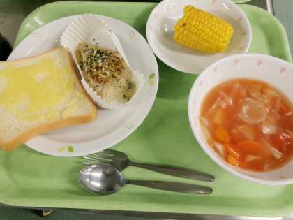チーズトースト 牛乳 魚のマスタード焼き 蒸しとうもろこし ミネストローネ