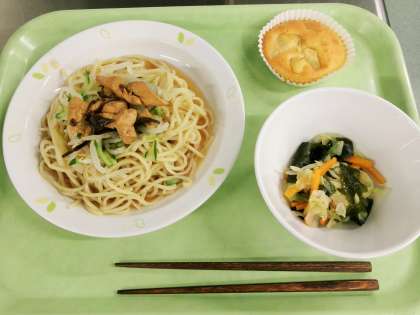 冷やし中華 牛乳 わかめサラダ パインケーキ