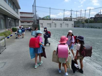 通知表「わかば」をもらって下校です。荷物の多い子もいますが、みんな元気に帰っていきます。一学期の頑張りを2学期につなげられるよう。夏休みも計画的に過ごしましょう。9月1日に元気に会えるのを楽しみにしています。