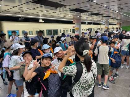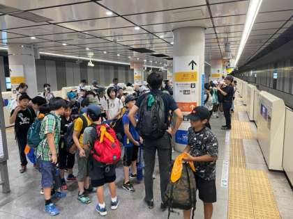 小田急線に乗って新宿駅に到着。山崎小の子どもたちを待っています。