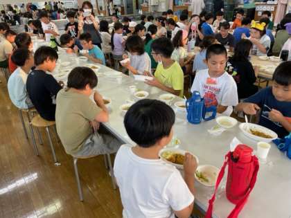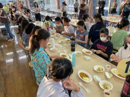 ランチルームで3校全員が集まっての夕食です。献立は、チキンカレーとサラダです。
