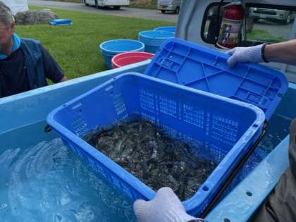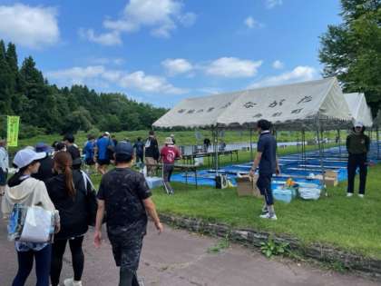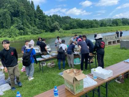 小国川の河原には、舟形小学校の保護者の方が集合して準備をしてくれています。