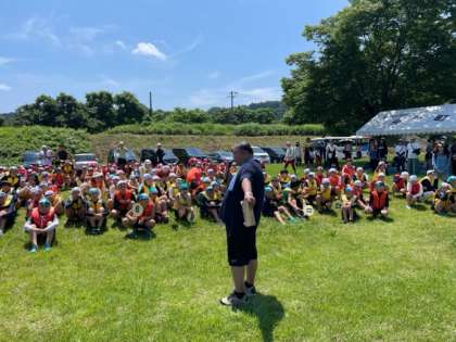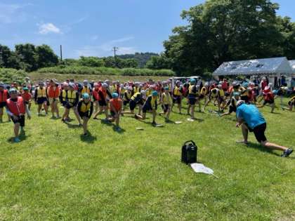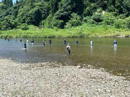 いよいよ川遊びが始まります。ライフジャケットを着て川に入ります。舟形小のお父さんたちが川に入って安全を確保してくれています。