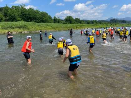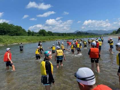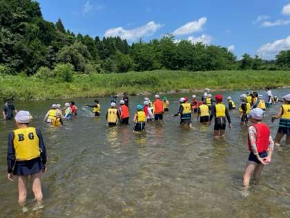 一回めの川遊びです。水の冷たさにびっくりしながら、楽しんでいます。