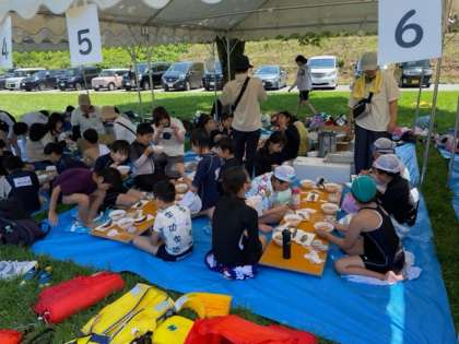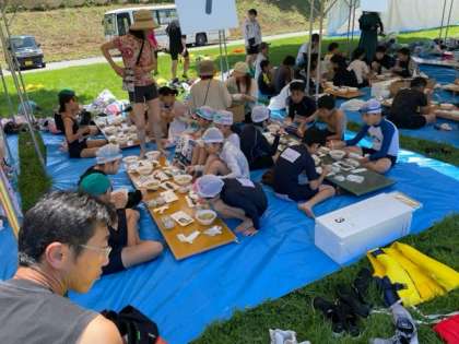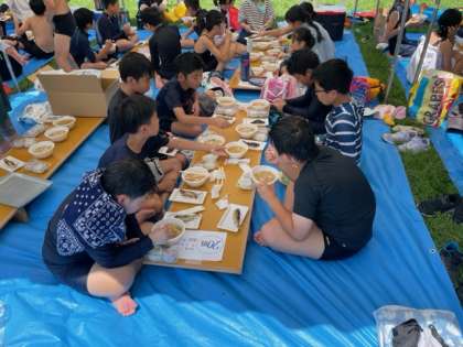 一回めの川遊びを終えて昼食です。舟形の方が用意してくれたおにぎりと豚汁、みんなで捕まえた鮎の塩焼きです。準備、ありがとうございました。美味しくいただきます。