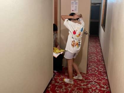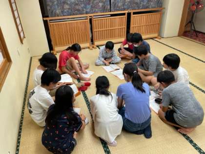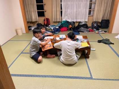 部屋に戻って、振り返りや検温をして健康カードの記入などをしています。中広間では、室長、班長会をして1日めの反省をしています。今日の反省を明日にいかしましょう。この後、就寝準備をしておやすみです。ゆっくり休みましょう。