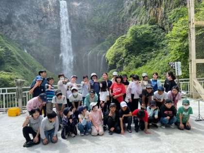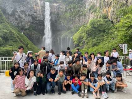 エレベーターに乗って100m下りて、華厳の滝に到着。水量が多く迫力があります。クラスごとに写真を撮って見学しています。