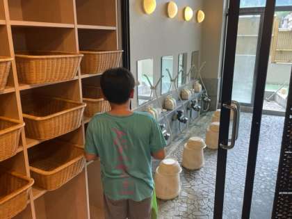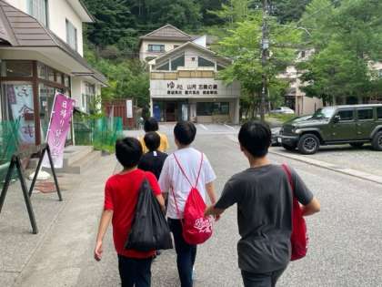 お風呂の時間になりました。今日は、女子が本館、男子が湯処です。ゆっくり温泉に浸かってハイキングの疲れをとりましょう。