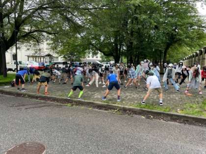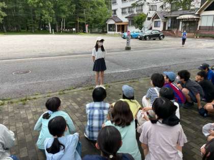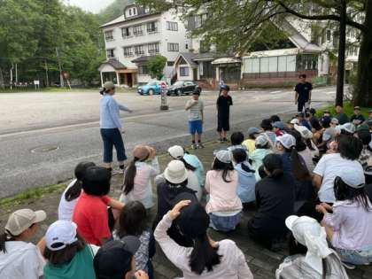 夜は、ゆっくり寝られたでしょうか。司会の子の楽しい寸劇から朝会がはじまりました。今日は、時計係男子のオリジナル体操で目覚めます。宿舎での生活も後少し、最後まで協力して過ごしましょう。