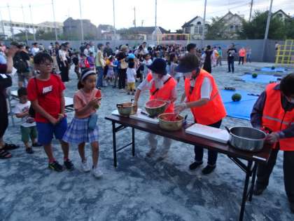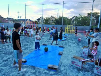 夏休み最後の土曜日・親児の会の皆さんを中心にスイカ割りと花火大会を開いてくださいました。1年生か56年生が参加しての会は、4年ぶりでしたが、準備をしっかりとしていただき、楽しい会になりました。美味しいスイカをみんなでいただきました。