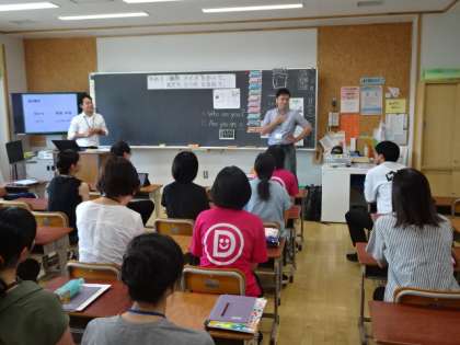 学校に来ていただいているALTの派遣会社の方に来ていただき、英語活動の研修を行いました、いつもと違って、今日は、子供になって授業を受けながらの研修でした。2学期からの授業に生かせる学びがたくさんありました。