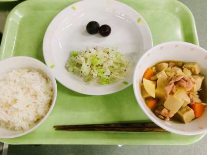 麦ごはん 牛乳 肉じゃが キャベツのゆかりかけ くだもの(巨峰)