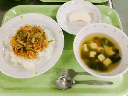 スタミナ丼 牛乳 豆腐とわかめのスープ くだもの(なし)