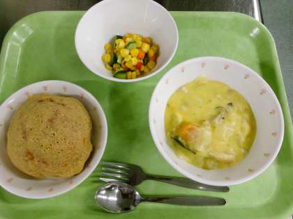 セサミビスキュイパン 牛乳 かぼちゃシチュー トロピカルサラダ