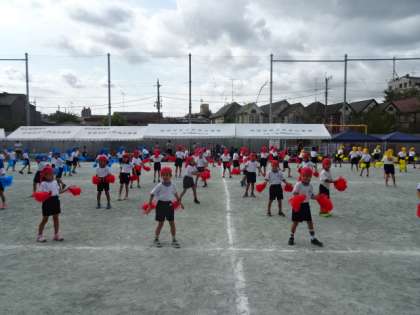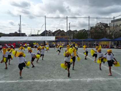 プログラム3、1年生の「ピッカピカの1年生」です。小学生になって初めての表現発表会。クラスカラーのボンボンを力いっぱい振りながら、校庭いっぱいを使って踊ります。
